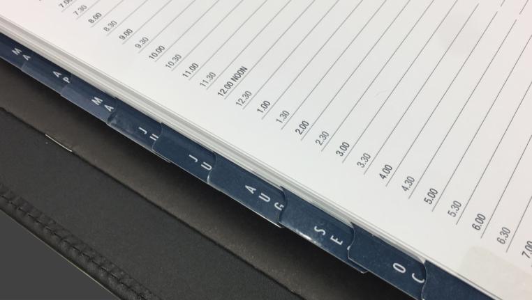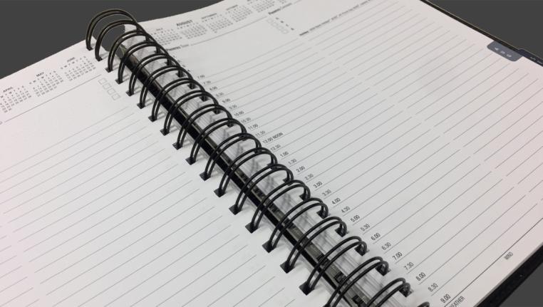 The Wiro bound diary is trimmed and hole punched down the spine for the Wiro spine fixing. Has a reinforced backing board which is inserted into a black slip on cover with metal corners on the front. This diary sits flat on any surface for ease of entering data on to every page. Includes monthly tabbed divider cards, business card holder sheets and heat sealed marker ribbon.